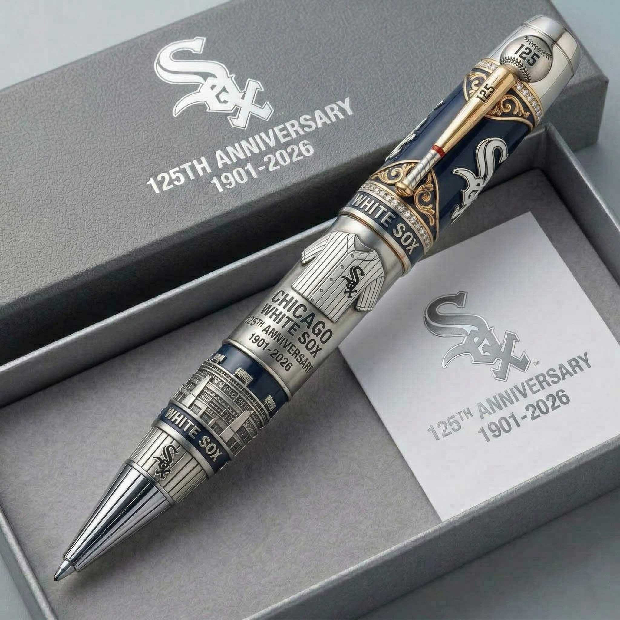 Celebrate 125 years of White Sox history with this elegant Chicago White Sox 125th Anniversary Commemorative Pen. Designed with premium silver-tone detailing, team-inspired accents, and engraved 1901–2026 anniversary artwork, this collector’s pen is a refined tribute to one of baseball’s most iconic franchises.
