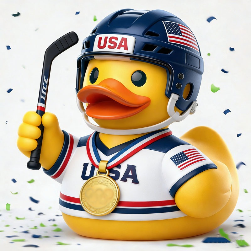 This duck proudly wears a red, white, and blue USA jersey, hockey helmet, and a gleaming gold medal — symbolizing the long-awaited return to Olympic glory.